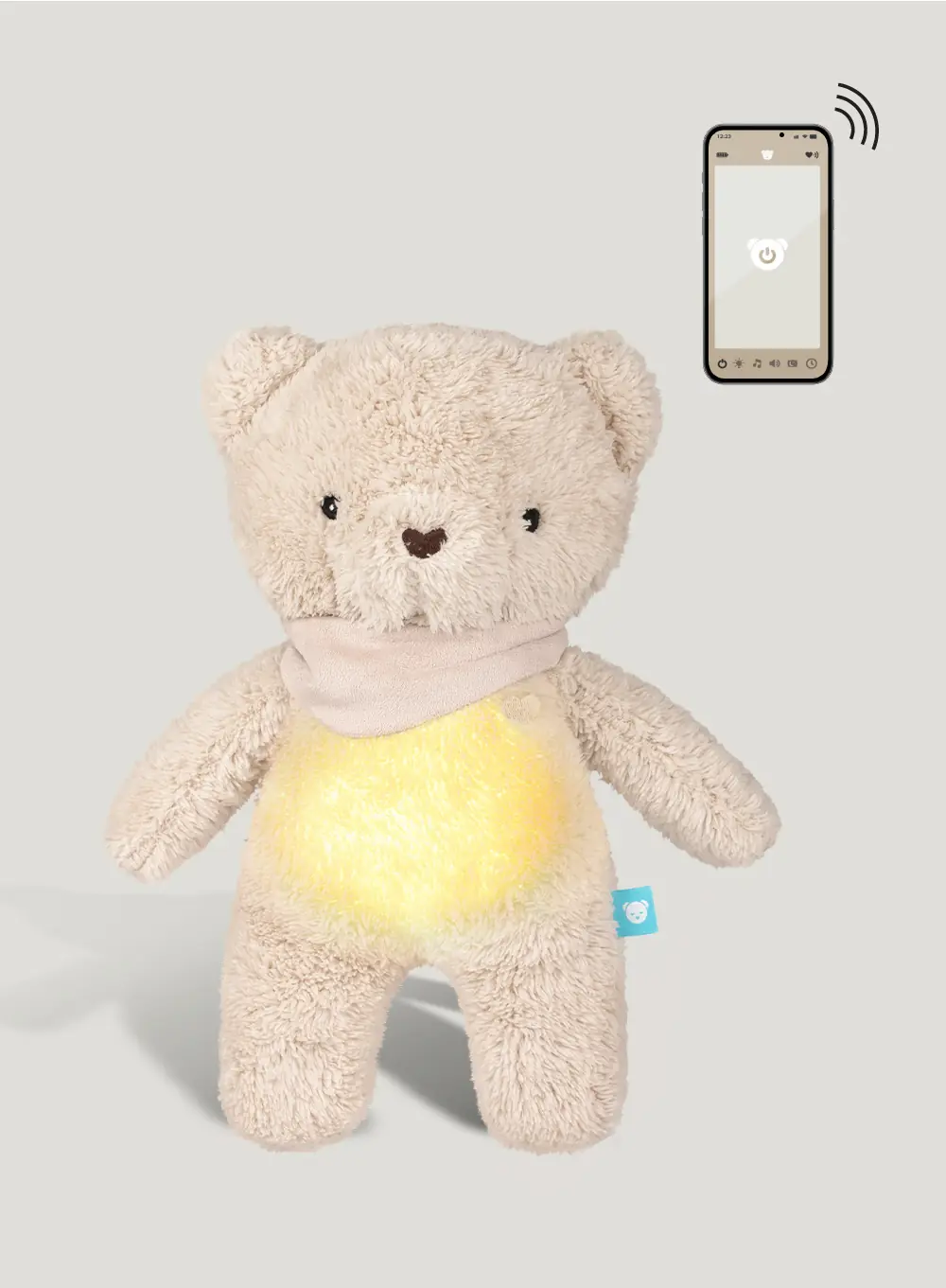 Entdecken Sie den 7-in-1-Schlafbegleiter mit Nachtlicht und App, der Ihrem Baby von den ersten Lebenstagen an ruhigen Schlaf und Komfort bietet. Der kuschelweiche Bär mit einer Steuerungsfunktion über eine praktische Smartphone-App ermöglicht Ihnen die volle Kontrolle über die Funktionen des Bären. Die intuitive Bedienung bietet Ihnen:
