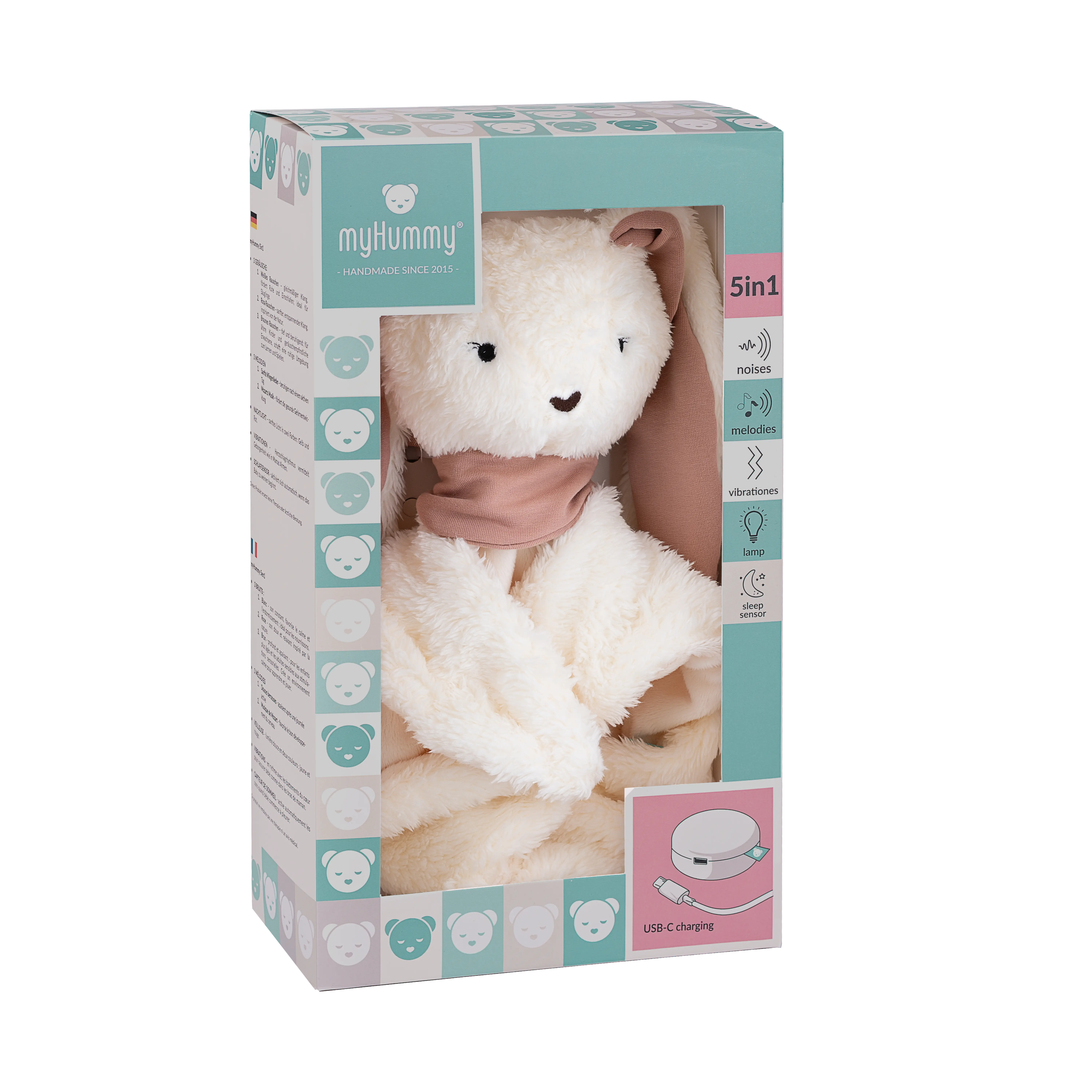 - Lieferumfang: Schmusetuch Häschen + Soundherz myHummy + 3 AAA-Batterien.